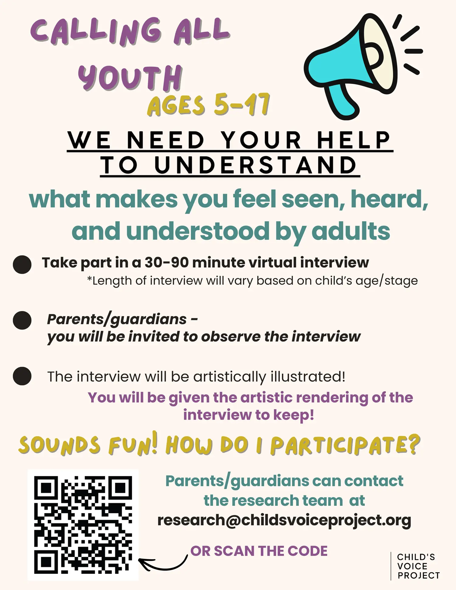 Please contact our research team at research@childsvoiceproject.org to learn more or sign up.
